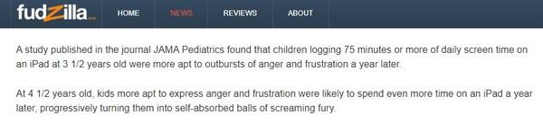 《美国医学会杂志 · 儿科学》上发表的一项研究发现,3 岁半时每天花 75 分钟或更长时间在 iPad 屏幕前的孩子,一年后更容易爆发愤怒和沮丧的情绪。一年后,他们可能会花更多时间在 iPad 上,逐渐把他们变成一个只顾自己、怒不可遏的孩子。