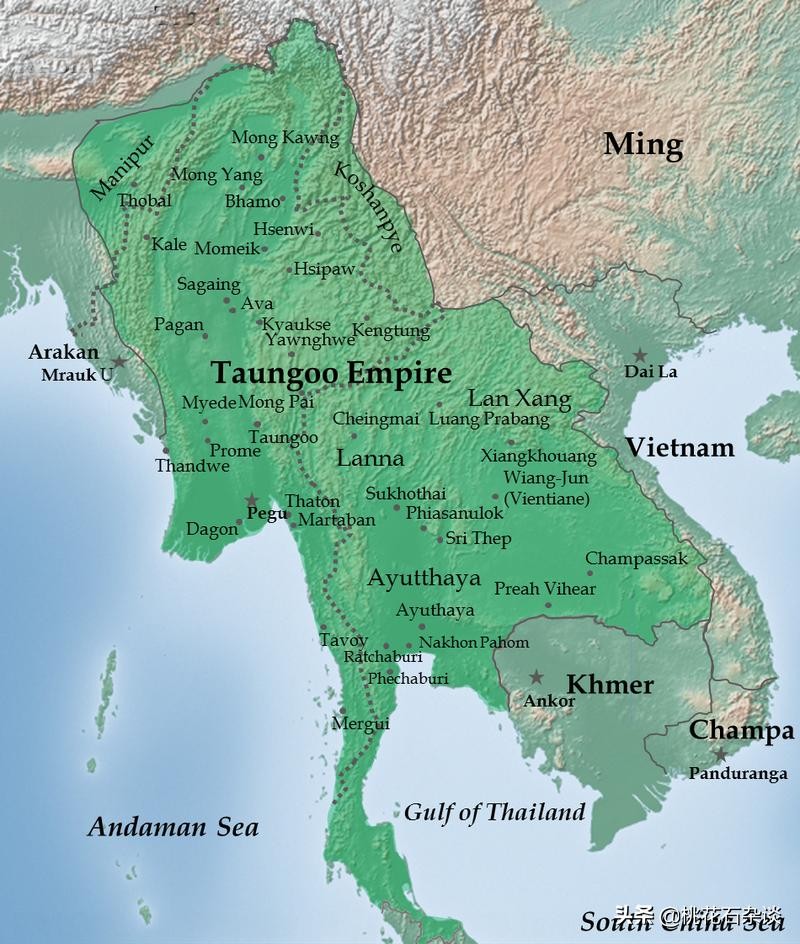 在公元1740年前后,缅甸少数民族孟族崛起,东吁王朝对大部分领土失控。在这种情况下,一贯桀骜不驯的东吁王朝才会在公元1750年对清朝进行了主动朝贡。但短短两年之后东吁还是被孟族人建立的贡榜王朝灭亡。而新崛起的贡榜王朝也确实曾经强盛一时,一度横扫东南亚,先后吞并了位于今天印度东北部的阿霍姆王国和曼尼普尔王国,还灭亡了位于老挝的南掌政权,并在着手灭亡位于暹罗(泰国)的大城王朝。