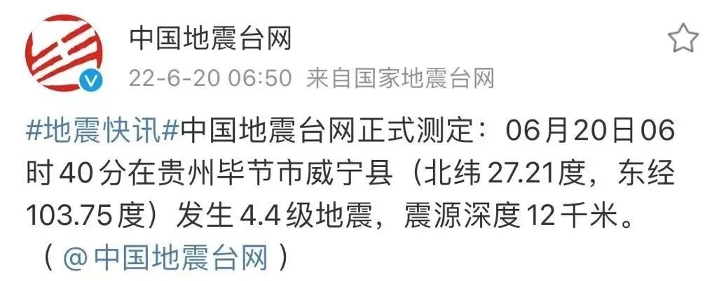 今天(20日)6时40分,在贵州毕节市威宁县发生4.4级地震,震源深度12公里。