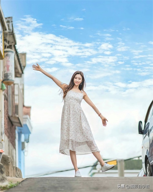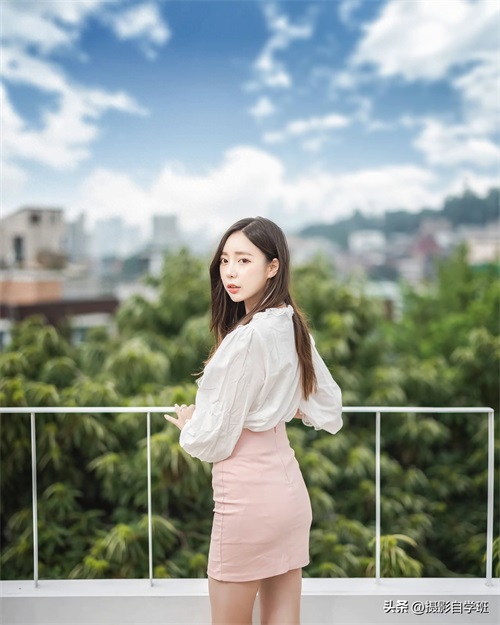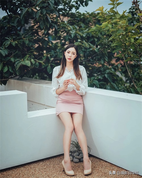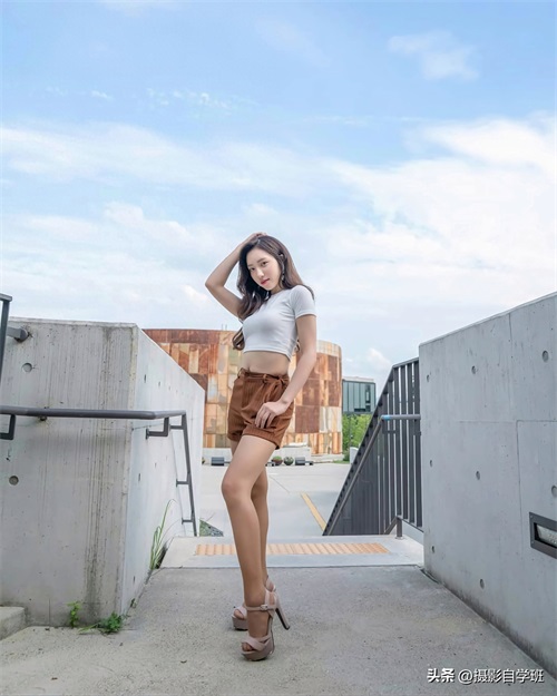 此时要注意摆姿的环境,如果像图6这样,墙上有一些栏杆,摄影师可以引导被拍摄的人,把双手伸向后面的栏杆,抓住栏杆,两条腿不要太直,像图6与图7这样弯曲,可以更好看。如果后面没有栏杆,那就像图7这样,一只手放在脑后,一只手放在大腿上。