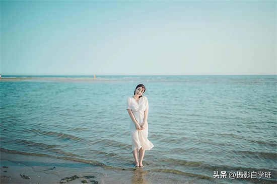 在海边拍照时,可以将双手交叉在胸前,或者将一只手放在腰间,另一只手放在身体的另一侧,这样会让你看起来更加自信、自然。如果你的手,不想有太大动作,那可以像图4这样,两手放在身前,或者像图5这样,自然垂在两侧,但手放下来了,就要注意,头部不要直直地在照片中,而应该像图4和图5这样,歪向一侧,让照片更显可爱。