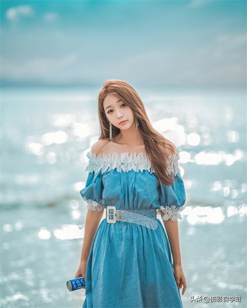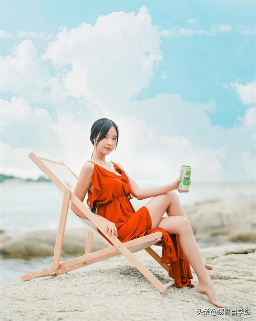 如果是在海边拍照,可以像图13这样,准备个椅子,椅子的颜色不要太鲜艳,人物衣服的颜色,要鲜艳一些,让她坐在椅子侧面回头看镜头,就可以了。