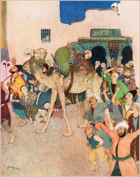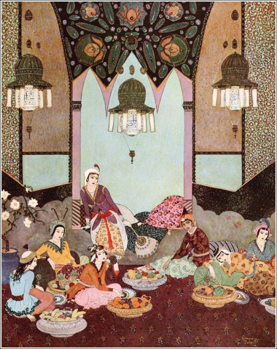 当时人们的评价是:这一组插画,凭借丰腴绚丽的色彩、浪漫离奇的想象力、奢华浓重的阿拉伯风情,让观者心醉神迷。
