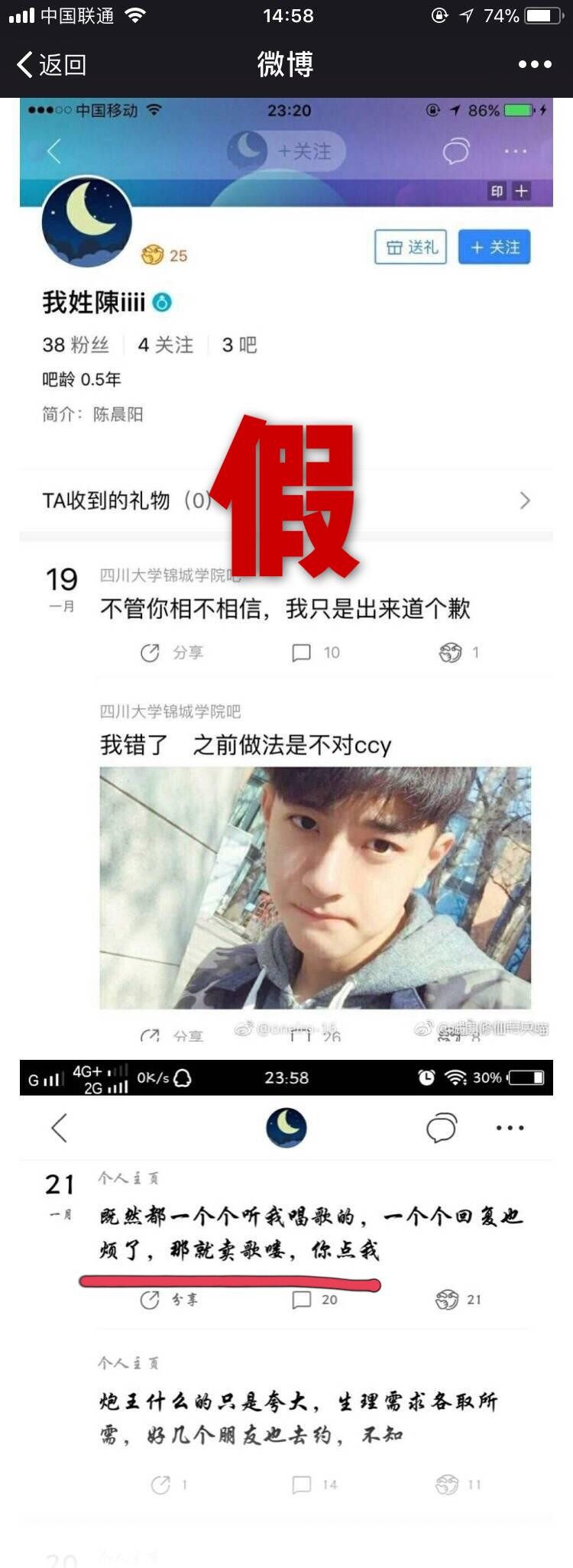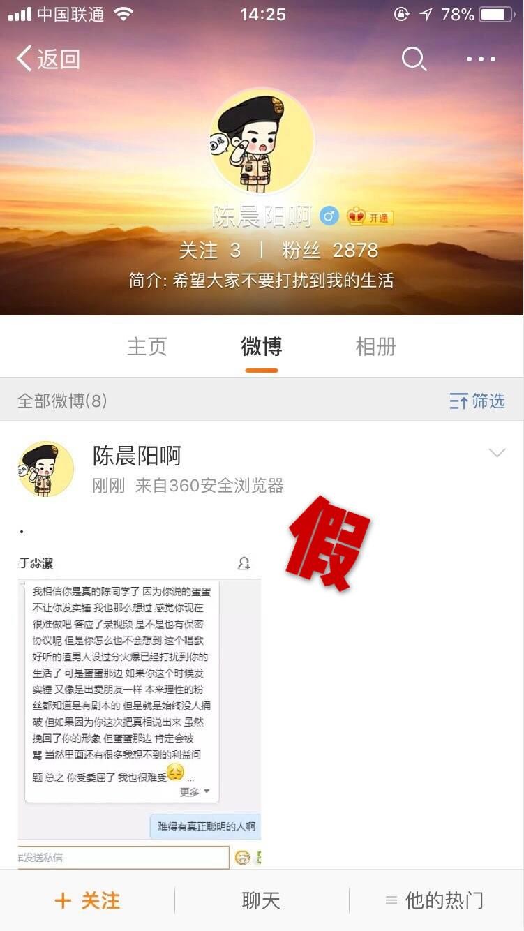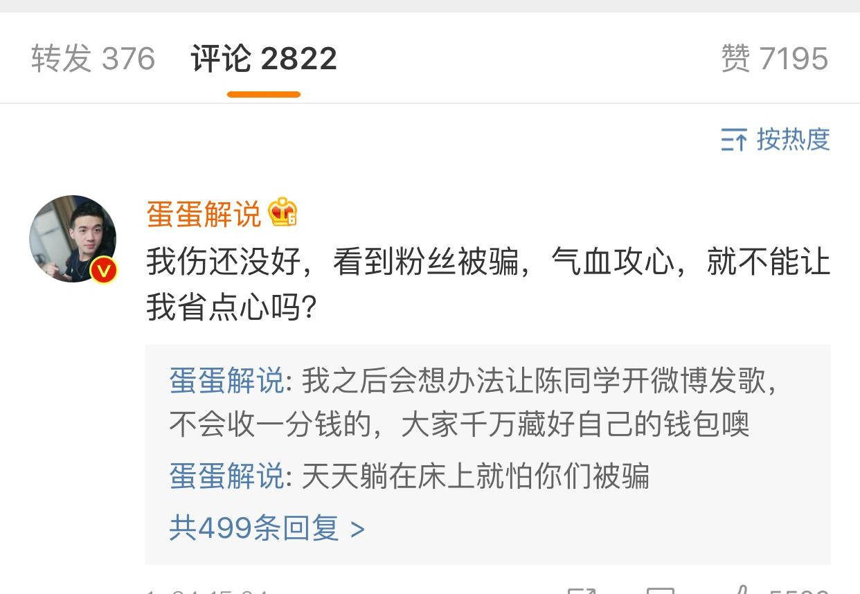 但是今天下午@蛋蛋解说发了一条微博,直接否认了上面两个微博,竟然还有在百度贴吧打着陈同学的旗号卖歌的,还真的有小女生相信被骗了。