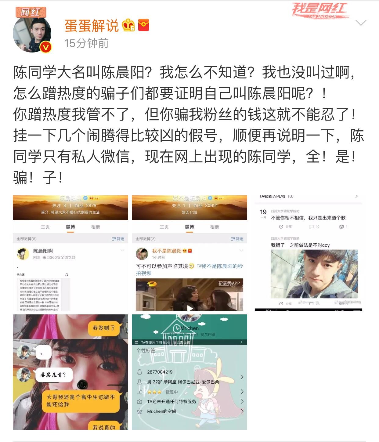 微博@蛋蛋解说已经说过网上的都是假冒的,但是还是有人打着陈同学的旗号出来,并且装的还挺像那么回事儿。