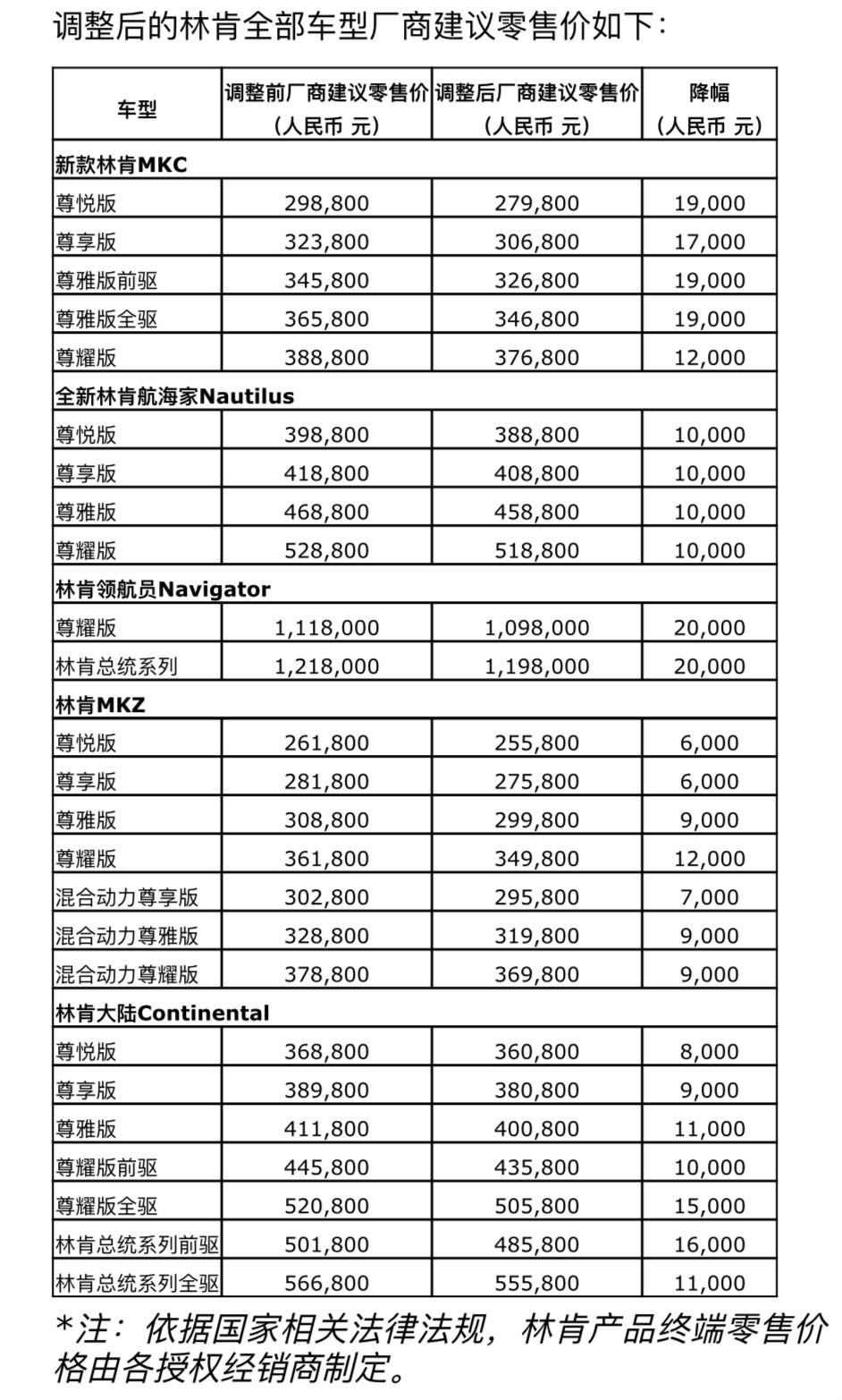 新京报快讯(记者 魏帅)今日,林肯中国官方发布消息,林肯积极响应国家下调制造业增值税税率政策,提前下调全部在售车型厂商建议零售价,调整后的厂商建议零售价将于今日起生效。