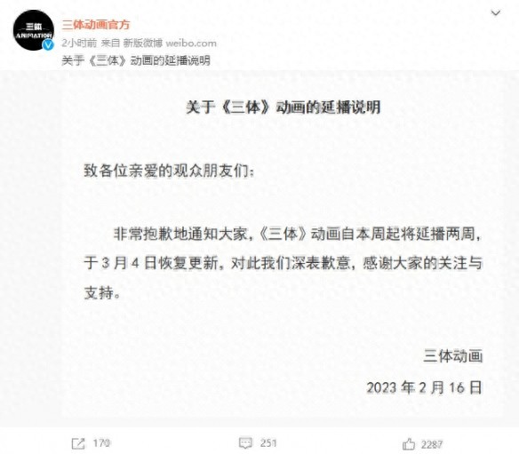 喜大普奔万策尽 艺画开天通知《三体》动画版停更两周
