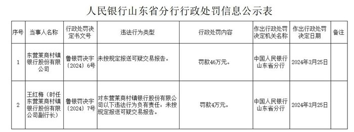 3月27日,中国人民银行山东省分行发布行政处罚信息公示表,公示表显示,东营莱商村镇银行股份有限公司因“未按规定报送可疑交易报告”,于3月25日被中国人民银行山东省分行进行行政处罚,罚款金额46万元。