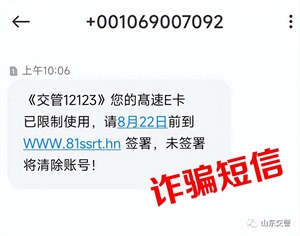 以“山东ETC”、“山东交管12123“等官方名义发送提醒短信,骗取车主信任。