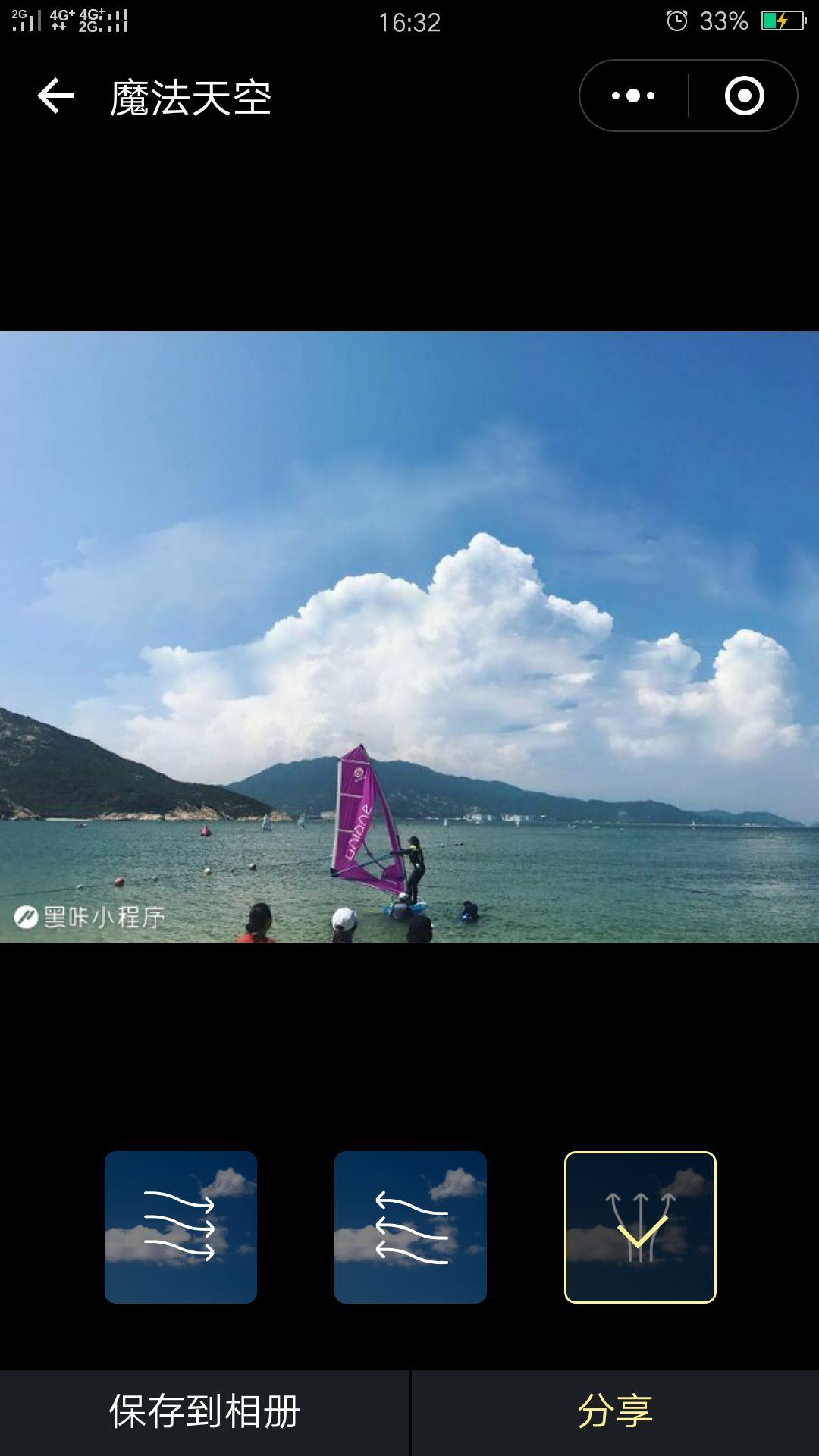 制作步骤同上,但需要注意的是照片中必须同时出现“天空”和“云朵”这两大元素。这一主题是为照片中的云朵加上动态效果,共有三种运动方向可供选择。