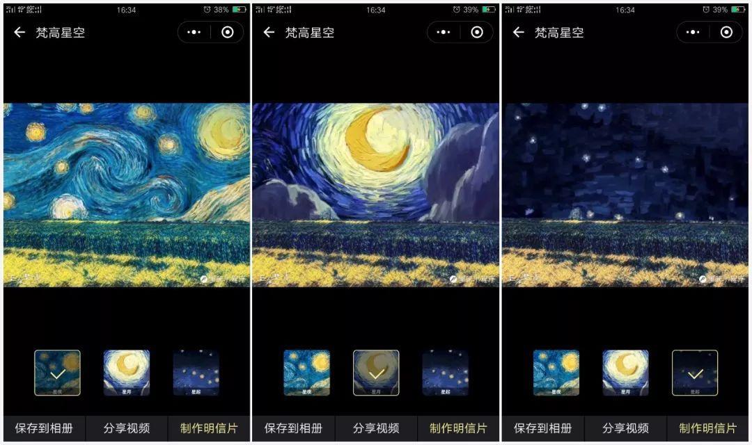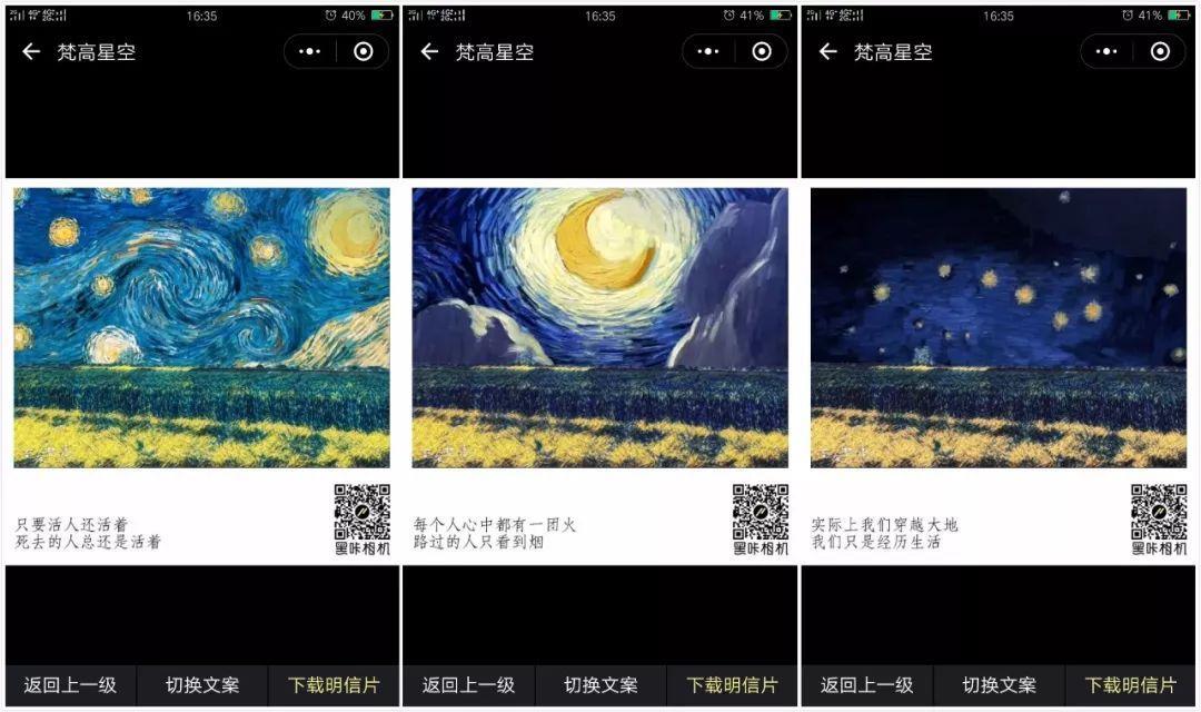 “梵高星空”主题下还有一个特别的功能,那就是“制作明信片”。点击右下角的“制作明信片”,系统将根据你选择的效果随机配上文案生成一张明信片,可直接分享,也可保存到本地。