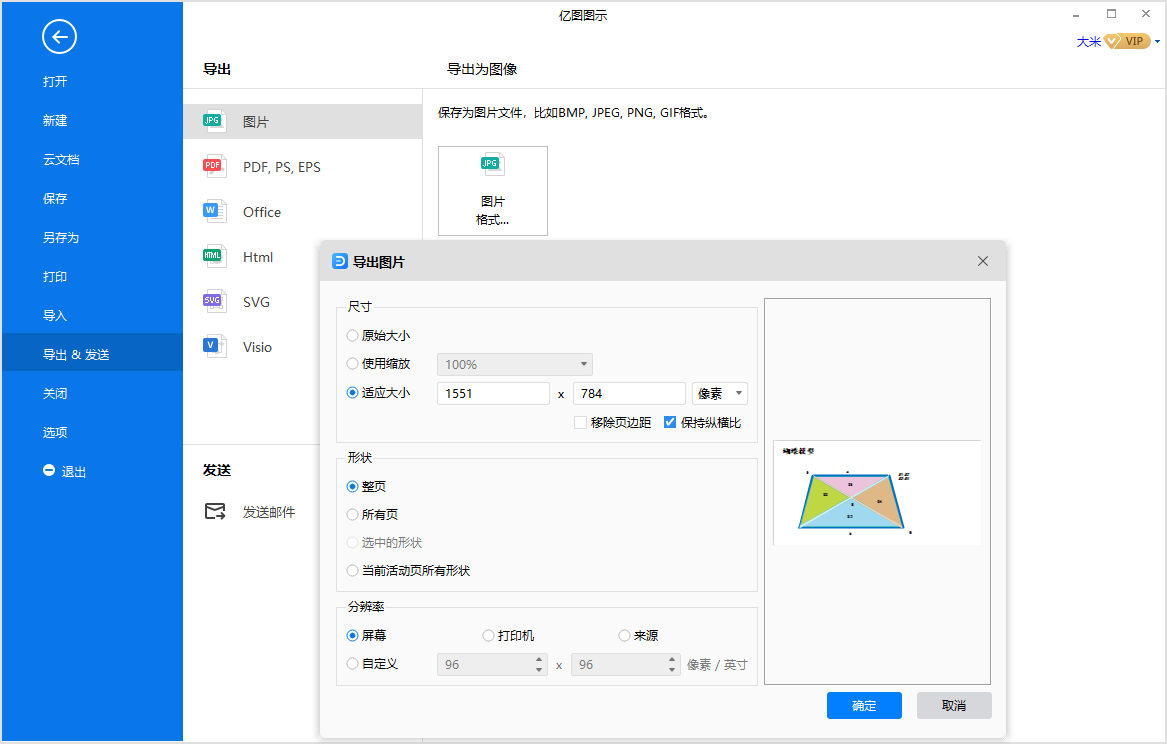 4、导出与导入格式:亿图图示不仅可以导入SVG、Visio、Office、等多种格式,在绘制完图表后还可以导出为图片、PDF、PS等格式。