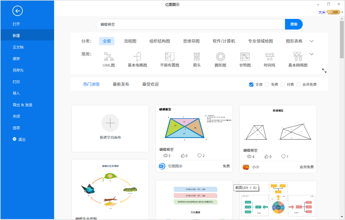第二步:新建蝴蝶模型,直接在页面搜索栏中搜索“蝴蝶模型”,然后再下方选择一个模板,点击使用。