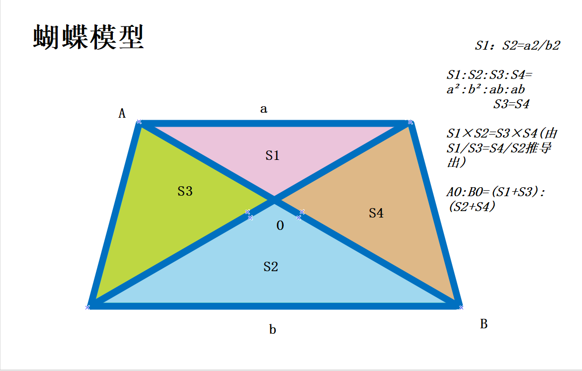 蝴蝶模型最早是由霍纳提出的欧式平面几何,因为形状酷似蝴蝶,所以才被称为蝴蝶模型,流传至今。由蝴蝶模型推导出的蝴蝶定理是解析平面几何的一项重要定理,在一个梯形中,两条过顶点相交叉的线,对角的两个三角形相似且面积相等,即S1=S2。在蝴蝶模型中,对角的两个三角形的面积都是相等的。