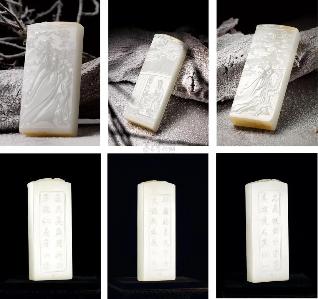 以三国时期刘备、关羽、诸葛亮三人这一传统题材入画,刻画细腻精致,人物神态逼真,三块玉牌既能独立把玩,亦可三块一起组成一幅“三顾茅庐”的画面,其设计可谓精妙。