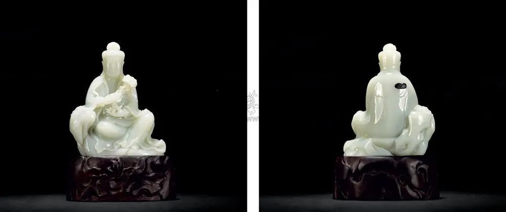 观音宝相庄严肃穆,衣纹飘逸,左手于膝施定印,右手自然下垂。整体造型清雅流畅,颈部雕刻细尤见功力,实属玉器造像中的精品。原属清宫内府藏品。