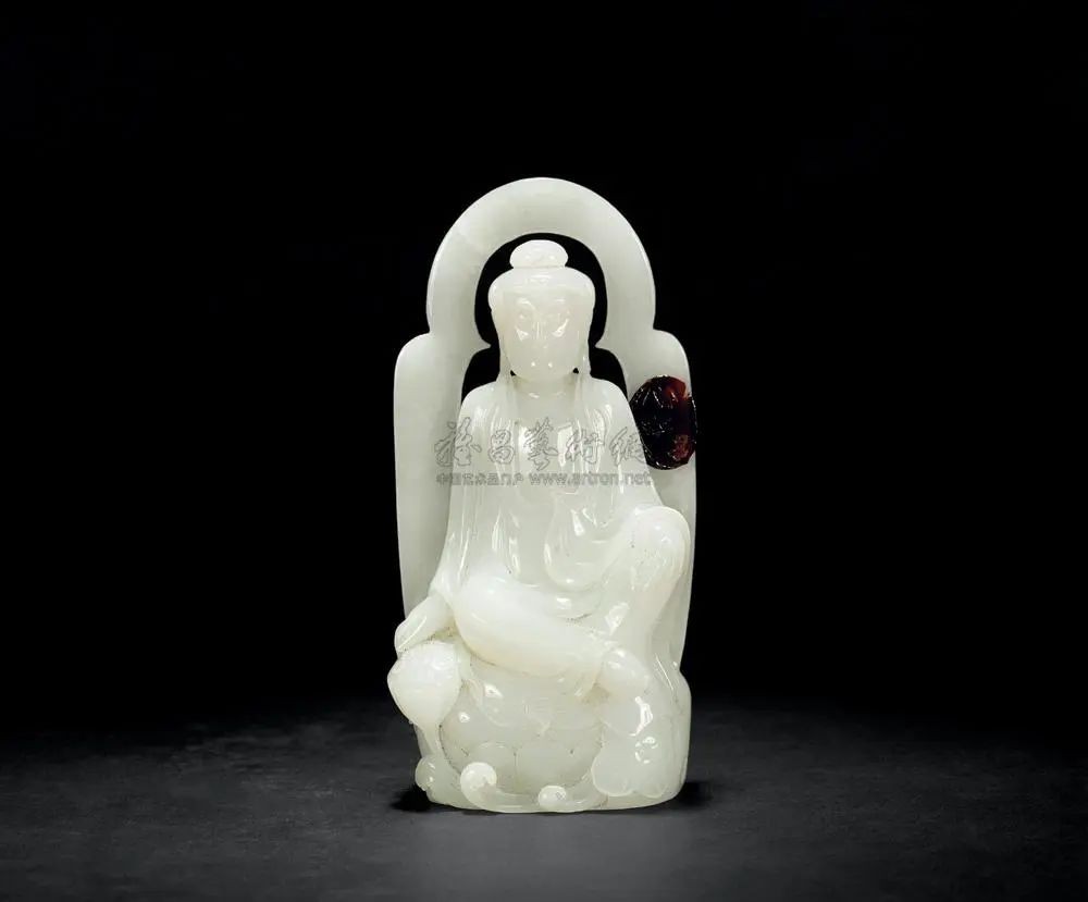 此件观音造像选用新疆和田羊脂白玉,质地细腻,莹透纯净、洁白无瑕、状如凝脂。