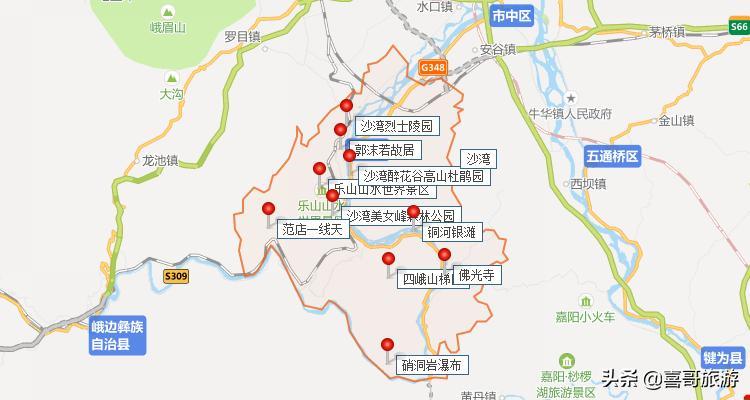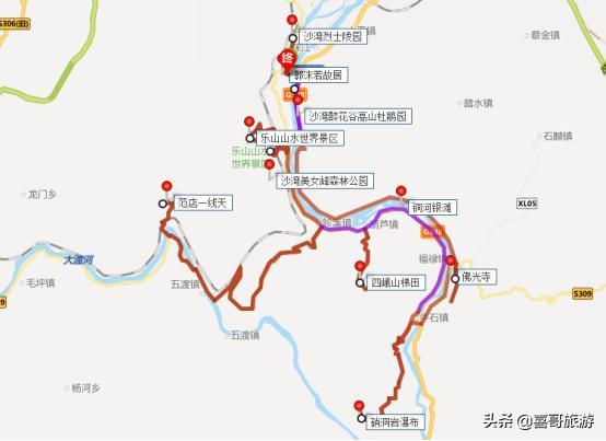 2、沙湾区十大景点自驾游行程路线:沙湾区-郭沫若故居-沙湾烈士陵园-沙湾醉花谷高山杜鹃园-乐山山水世界景区-沙湾美女峰森林公园-范店一线天-四峨山梯田-铜河银滩-硝洞岩瀑布-佛光寺-沙湾区。