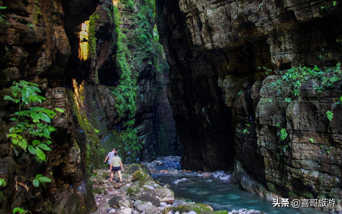 【范店一线天】位于四川省乐山市沙湾区范店一线天西北。范店一线天两山裂谷,长2公里,如刀削斧劈,深达200余米,极为险峻,谷中一小溪流过,人行谷中,仰首望蓝天,只见一线。