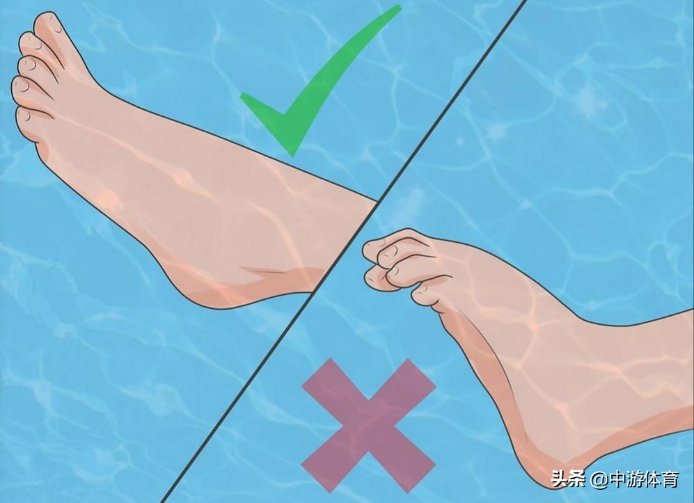 如果你勾着脚打腿,那么脚背在下打的过程中就产生不了向后的推力,虽然看起来小腿是在向后打腿,但是勾脚的脚背处却是在向前,一前一后两种力一抵消,也会导致你的打腿效率大打折扣。所以在自由泳打腿时一定要保证自己脚踝背屈,展开脚踝让脚背向后充分对水。