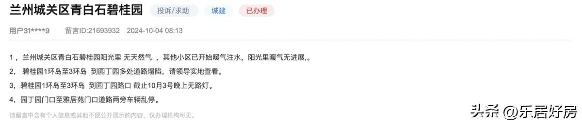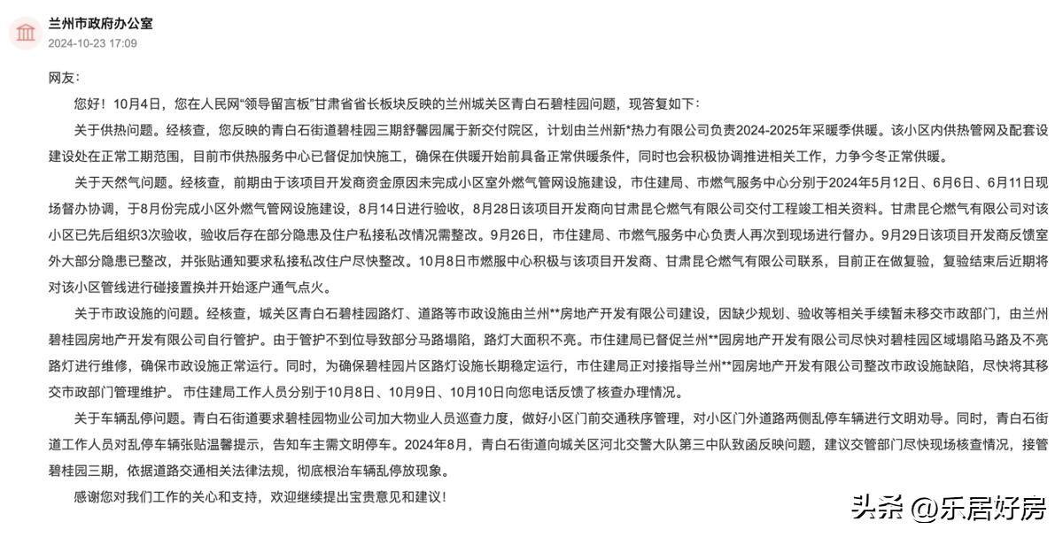 对于,兰州碧桂园上述问题,相关部门可谓件件有回应,希望后续都能落实到实处。因为,兰州碧桂园对于居民的影响实在太大了。据网友信息显示,受影响的人群至少20万+,而且以年轻人为主。