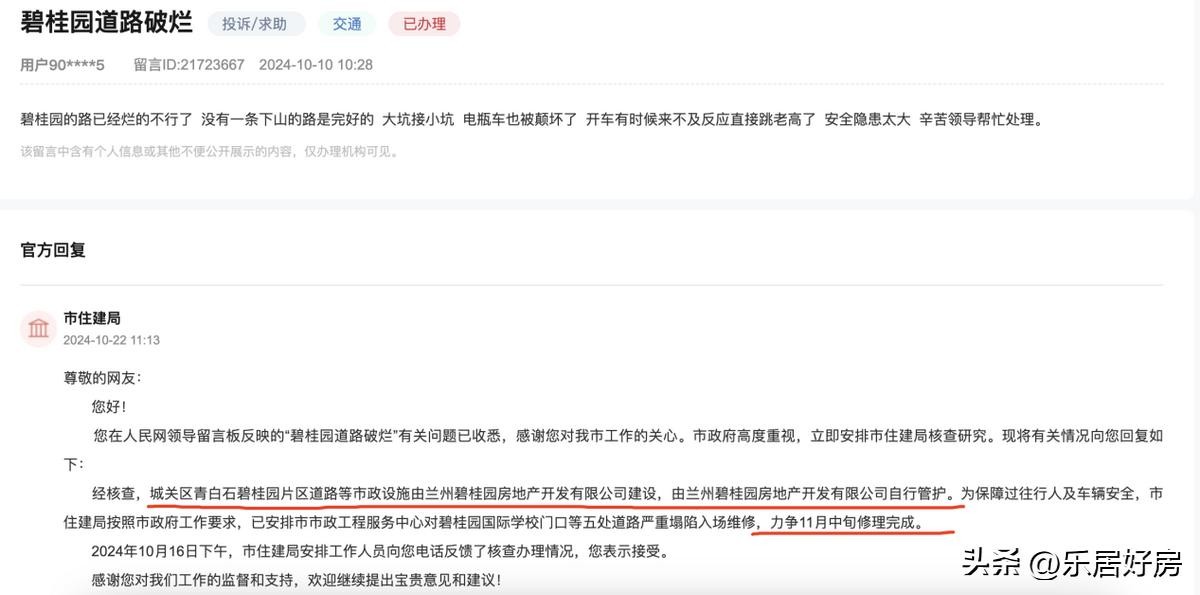 对此,相关部门回复表示,城关区青白石碧桂园片区的道路等市政设施均有兰州碧桂园房地产开发有限公司建设,且自行管护,目前已经安排入场维修,力争11月中旬修理完成。
