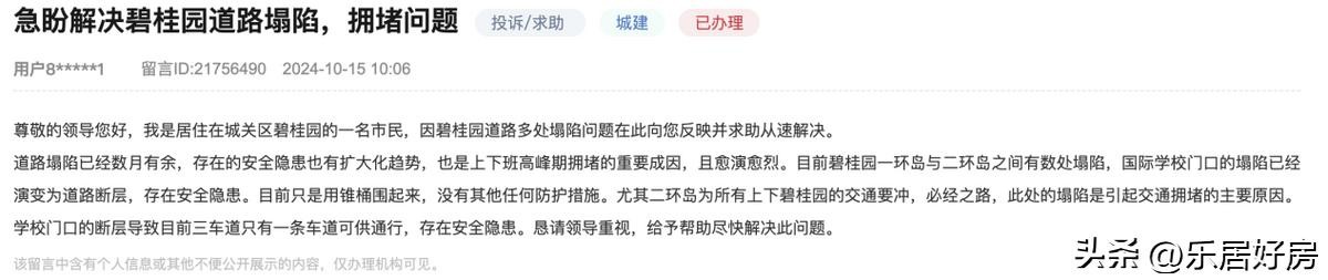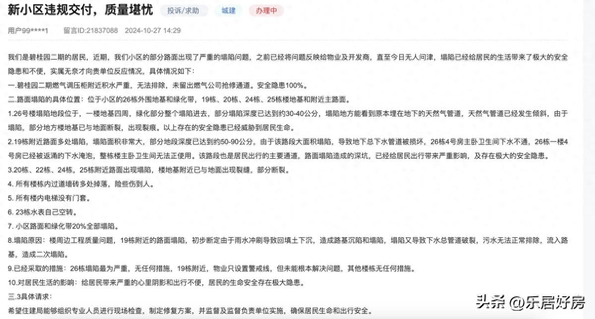 至于道路塌陷、路灯不亮等市政问题,为了确保长期稳定运行,相关部门正在指导碧桂园整改,并尽快将其移交市政部门管理维护;针对车辆乱停的问题,已经要求碧桂园物业公司加大巡查力度。
