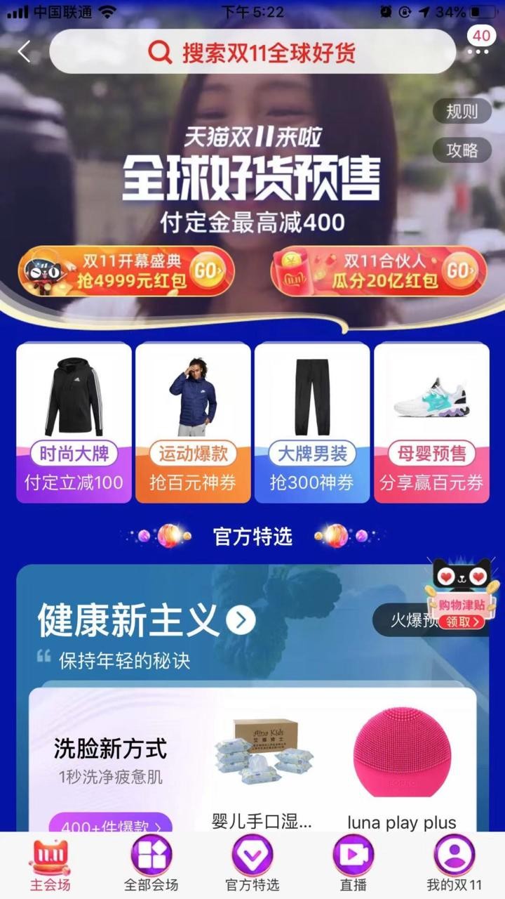 尽管距离双十一还有20天的时间,但属于购物者的狂欢已拉开了序幕。记者今天打开手淘首页和天猫首页发现明显感受到了双十一的氛围,在21日零时淘宝天猫首页已经开设了双十一全球狂欢节专区,双十一预售和瓜分20亿红包活动以及领取购物津贴全面开始。