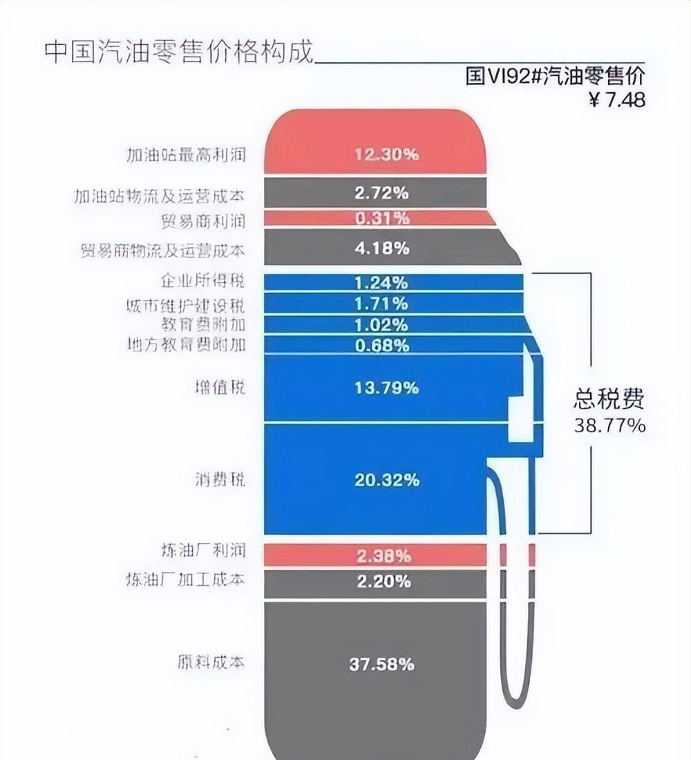 从汽油的零售价格构成来看,原料成本只占比38%左右。而各种税费则占据接近40%的比例。也就是说,在95号汽油8。8元的零售价格中,有接近3。5元是各种税费。