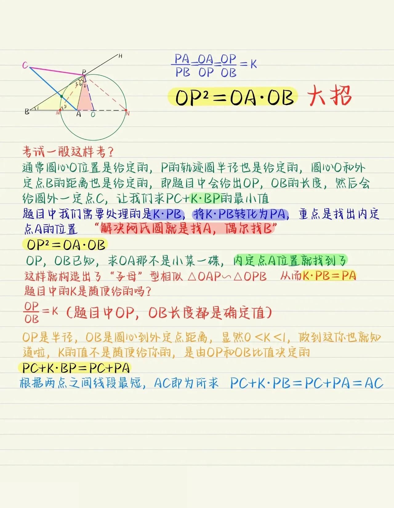 总的来说,阿氏圆是数学和几何学中一个有趣且实用的概念,它揭示了平面上点到两定点距离比值与轨迹形状之间的关系,为我们提供了一种新的视角和方法去理解和解决几何问题。