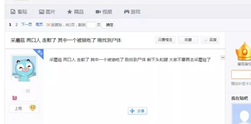 经调查:一名百度贴吧用户在大雁吧中发文称“采蘑菇两口人,走散了,其中一个被狼吃了,刚找到尸体,剩下头和腿,大家不要再去采蘑菇了”等信息。
