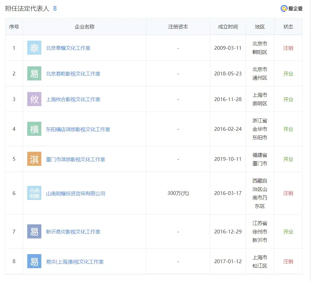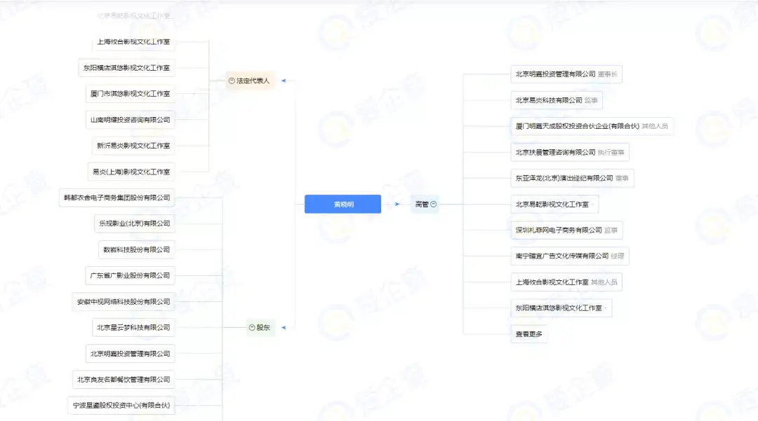 爱企查公开资料显示,黄晓明是北京易乾、上海攸合等共计8家公司的法定代表人,持有韩都衣舍、乐视影业、广东广影、博纳影视等共计41家公司的股份。