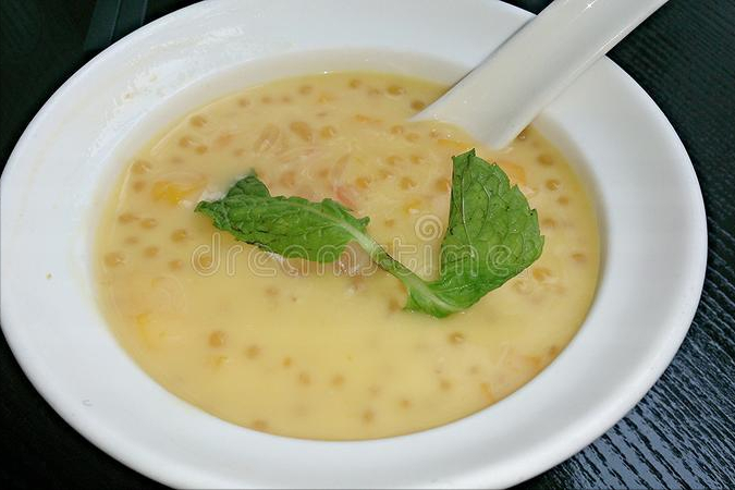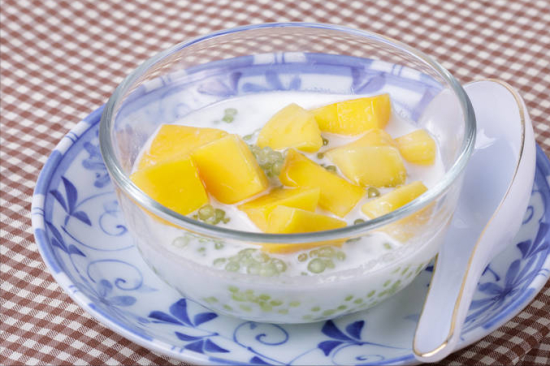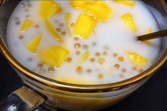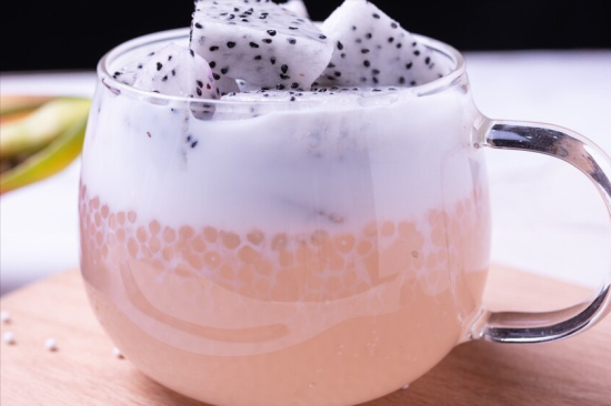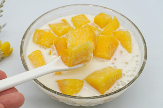 4、准备适量的牛奶或者椰汁,然后往其中加上适量的白糖,将其彻底搅拌均匀,倒在煮熟的西米中就可以了。最后可以加上桃子、芒果等自己喜欢的水果,这样一份西米露就做好了。