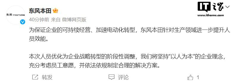 东风本田官博今日发布公告,就近日网传裁员一事进行了回应: