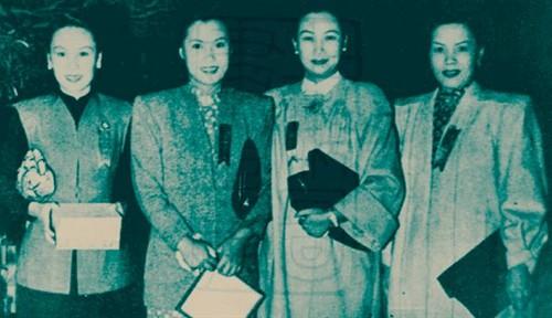 图为:中国福利基金会于1947年10月1日假座上海中央银行俱乐部举行园游晚会,由宋庆龄女士出席主持影星担任义卖工作。图为担任义卖工作的影星(由右至左)舒绣文、胡蝶、秦怡、白杨;胡蝶作为老牌明星,始终是后辈们心中的一个“神”,到那始终都是气场强大的女明星。