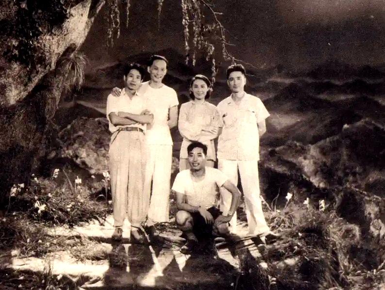 图为:在电影《一江春水向东流》(1947)的摄影棚内,后排左起黄绍芬、郑君里、白杨、蔡楚生,前排蹲者朱今明