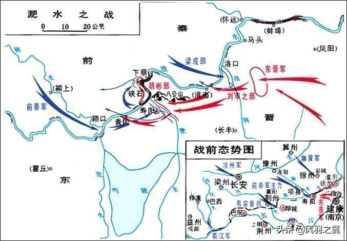 公元383年秋,前秦王苻坚强征各族人民组成百万军队大举攻晋。苻坚兵分三路:北路由徐州南下,西路沿江东进,中路经由黄河、汝河、颍口(今安徽寿县正阳关)指向南京,水陆并进,旌旗遮日。苻坚得意洋洋地说:“我有如此众多的兵马,只要将所有的马鞭投入长江,便足以截断水流。”这就是成语“投鞭断流”的由来,可见秦军是人马众多,兵力强大。