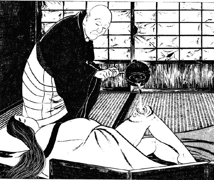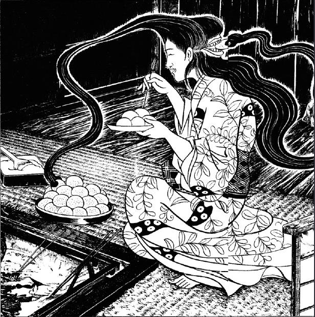 此外,日本还有一个二口女的故事大概也是由人面疮演变而来的。这种二口女,即身上长了两张嘴女人,第二张嘴位于后脑勺,或者后颈部,隐藏头发底下。这张嘴食量非常的大,永远也吃不饱。传说这个二口女是一个狠毒的后母,她故意不给继子吃东西,将继子活活的饿死。继子过世后不久,这个后母路过家中的后院,正在劈柴的男仆手滑,不小心让斧头飞了出去,正好砍中了后母的后脑勺。结果这个伤口就变成了一张嘴。这张嘴必须不停的吃东西,一旦不吃就会疼痛无比。有时它还会自言自语的说道:“跟我道歉,跟我道歉。”这显然是在暗示,二口女背后的口是继子的怨灵化成的,与中国神话中人面疮相同。然而,有些版本则把二口女说成是山姥,其本身就是一种妖怪,而非遭到附身的人类。