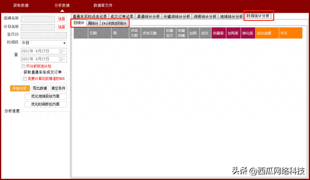 时间统计分析,细化到每30分钟的时间统计,周、日、时段等数据完全按照直通车后台的数据进行划分,做到每个时间都能找到对应的数据进行匹配。