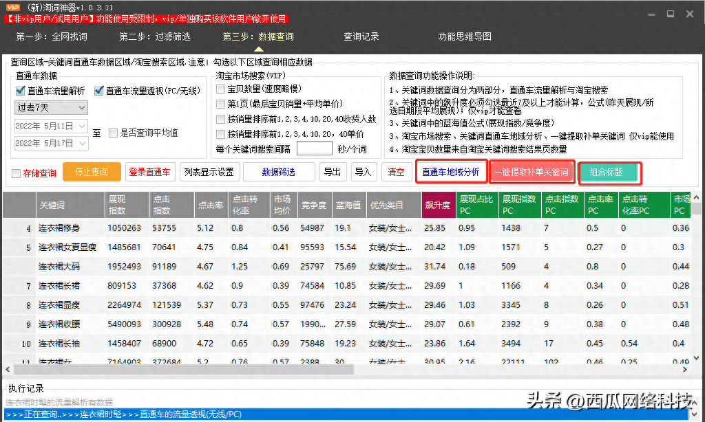 还可一键组合关键词及词根,获取直通车流量解析关键词及数据,一键提取补单关键词以及自动组合标题。