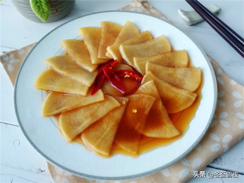 【腌甜酸萝卜】所需材料:白萝卜1/2个、干辣椒3个、盐4克、白糖3汤匙、米醋1汤匙、酱油2汤匙