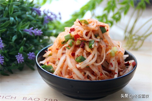 【香辣萝卜丝】所需材料:白萝卜1个、小葱2-3棵、盐半汤匙、白糖2汤匙、辣椒末半汤匙、辣椒粉半汤匙、大蒜4-5瓣、芝麻(熟)半汤匙、白醋1汤匙、