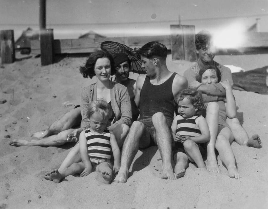 格拉迪斯-贝克(左)与婴儿诺玛-简-莫滕森(前)和朋友在海滩上。