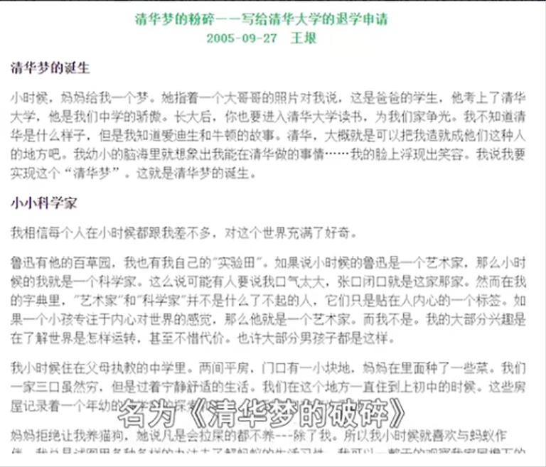 在明确表达了自己退学的决定后,王垠写下了这篇长达1.7万字的《清华梦的粉碎》,而他也成为了清华史上第一位退学的博士。