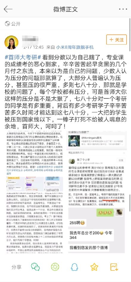 网友“Ella陶”微博发帖哀嚎“看到分数以为自己瞎了”,称考研两门专业课的成绩低得超乎想象。而这并不是个别现象,微博上、考研QQ群也都有考生反映考研首师大专业课成绩“惨不忍睹”,分数与预估分相差少则二三十,多则四五十分甚至七八十分的都有。