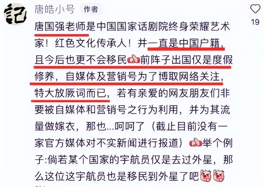 也是因此,唐国强的移民传闻曝光后,在网络上掀起轩然大波。