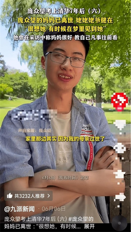 抖音@九派新闻:庞众望考上清华7年后,妈妈已去世,姥姥姥爷健在