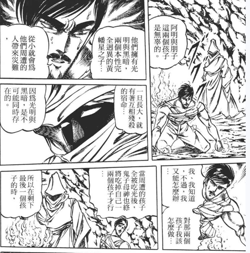 魔族女人就是孔雀的母亲,两个人生活在井中,光明与黑暗结合,孕育出新的生命,产下双胞胎一男一女,于是光明与黑暗之子诞生,与此民时也正是数千年才一次的大凶星,黄幡星降临,里高野就将这对双胞胎认定为毁灭世界之子。