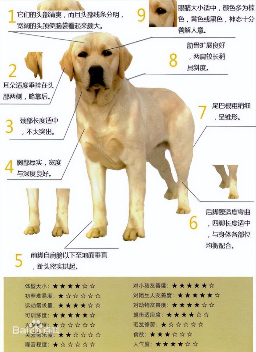 下面会详细的介绍拉布拉多的各个部位的形体特征
