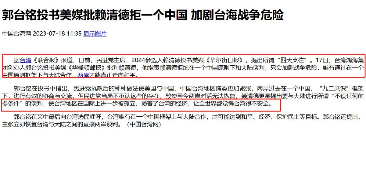 《郭台铭投书美媒批赖清德拒一个中国 加剧台海战争危险 》